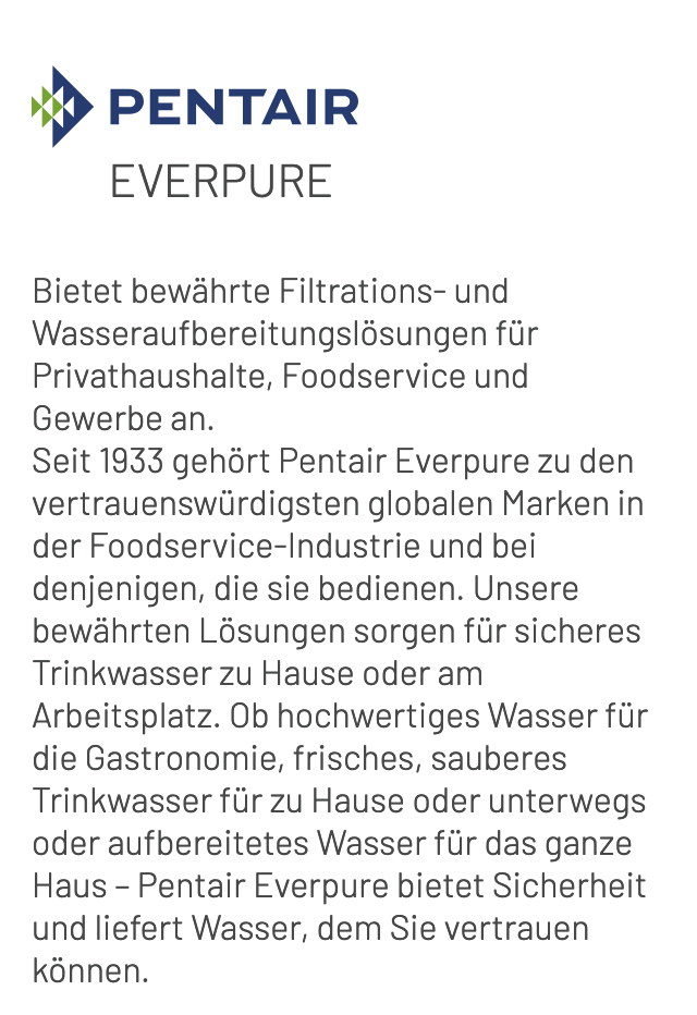 Auf Basis einer umfangreichen Kosten-Nutzen-Analyse haben wir uns aus dem vielfältigen Angebot an Wasserfiltern für ein ganz bestimmtes Aktivkohlefiltersystem entschieden. Das US-amerikanische Unternehmen Pentair bietet intelligente und nachhaltige Wasserlösungen und ist u.a. Marktführer bei Spezialfiltersystemen für Getränkeschankanlagen in der Gastronomie.