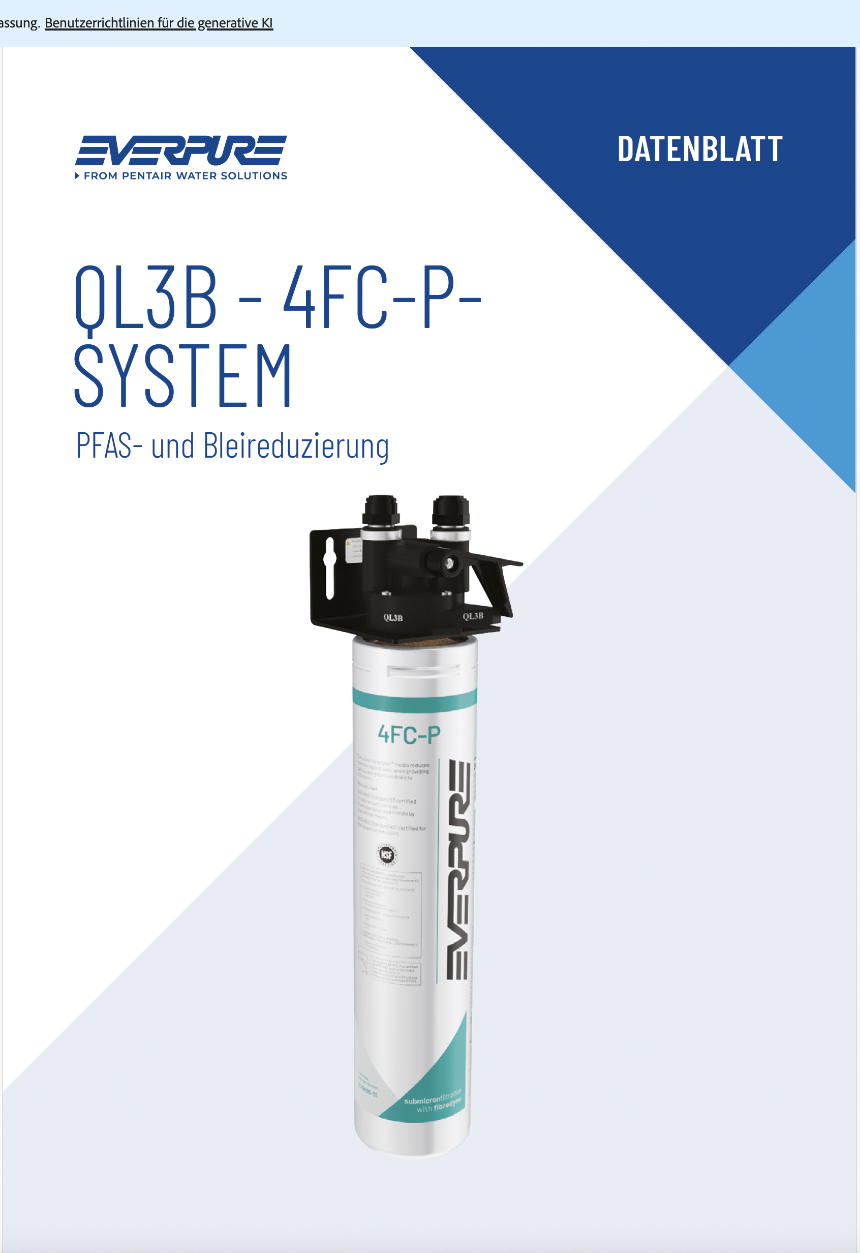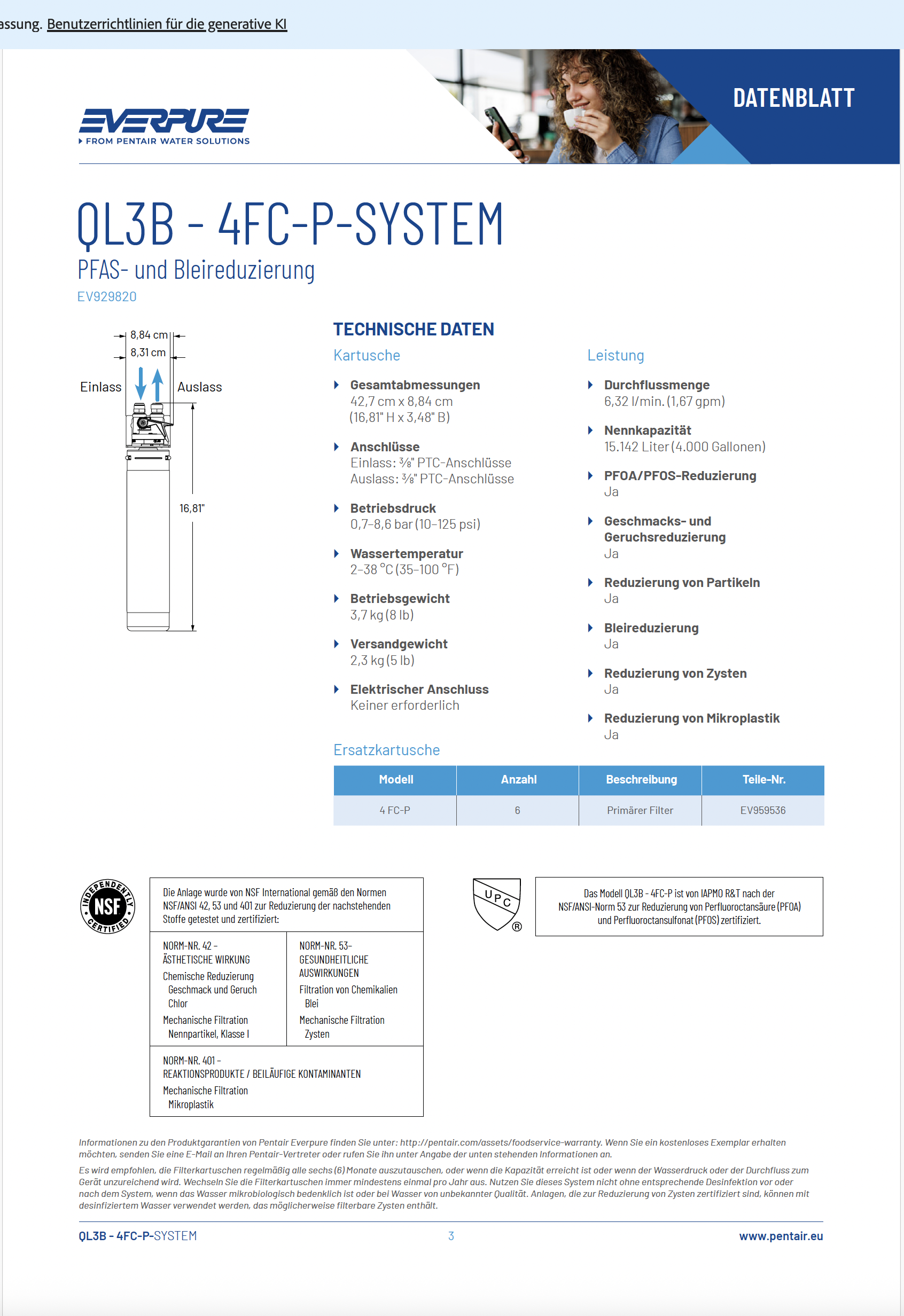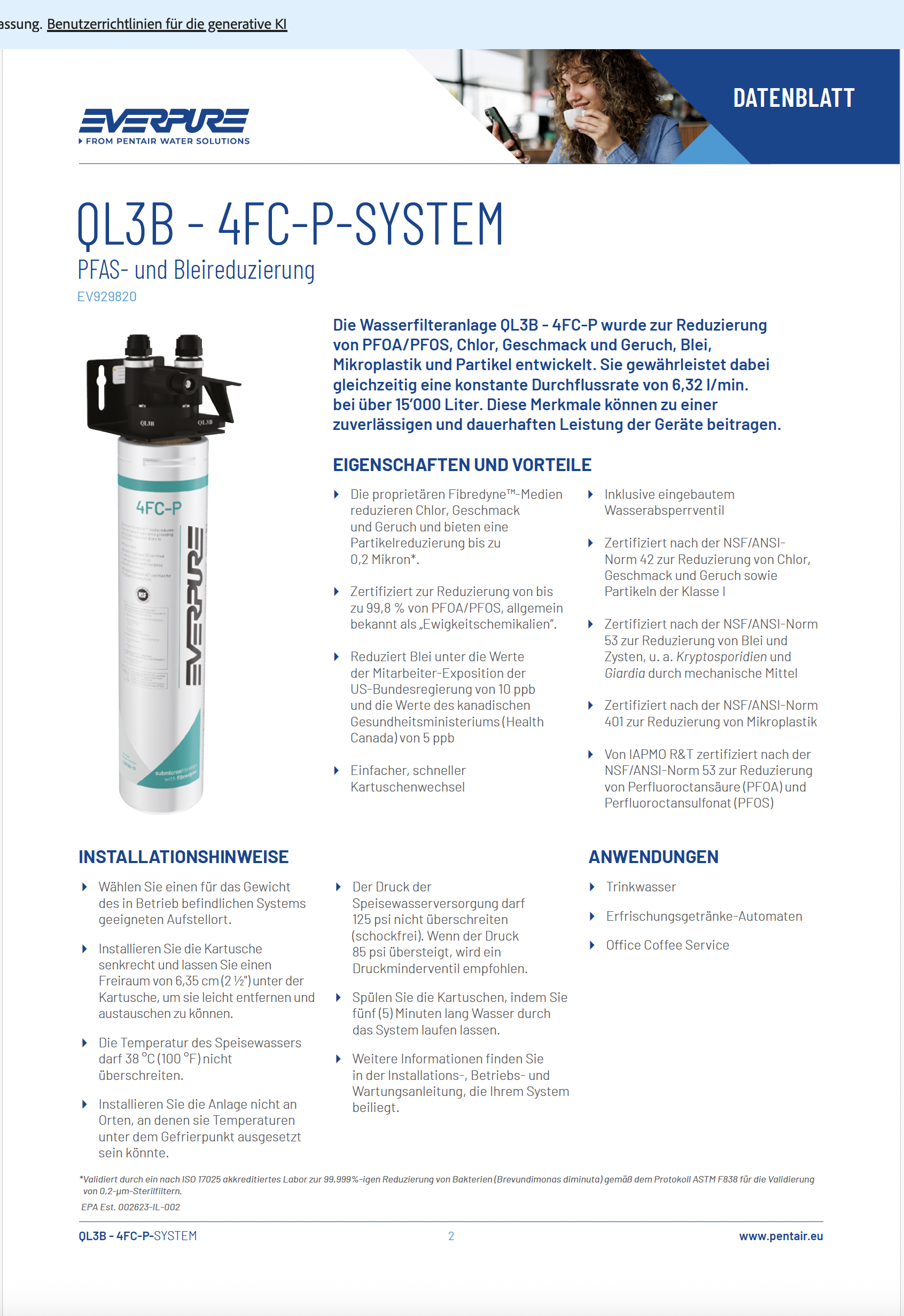 Der Spezialfilter filtert zertifiziert zusätzlich PFAS (PFOA/PFOS) sowie Flouride aus dem Wasser.